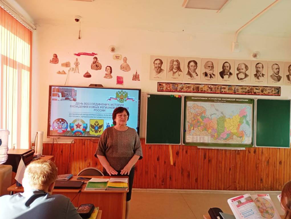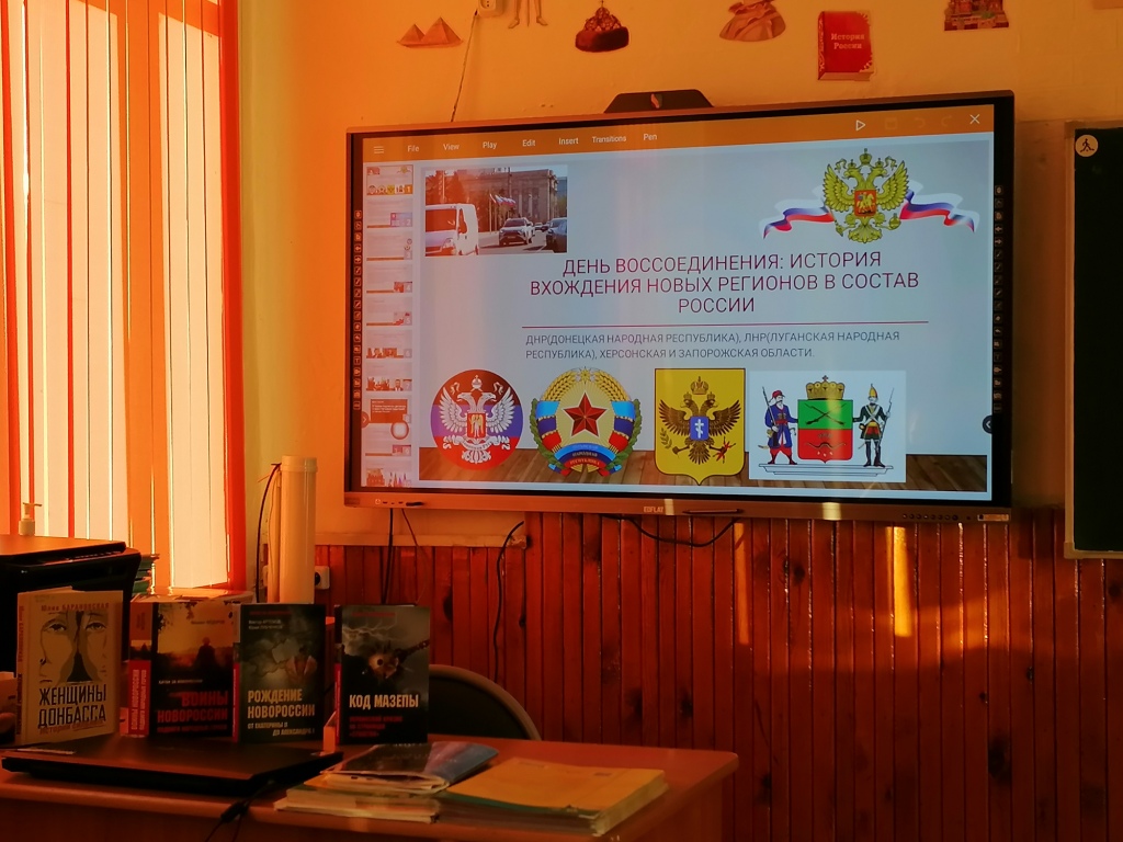Накануне этой памятной даты для восьмиклассников Новомошковской школы библиотекарь провела час истории «День воссоединения Донбасса и Новороссии с Россией». Учащиеся посмотрели презентацию о трудном пути вхождения новых регионов в состав Российской федерации. Библиотекарь рассказала об исторических корнях единства России и новых субъектов, познакомила с книгами о прошлом и настоящем новых территорий. Дата 30 сентября стала символом единства русского народа.