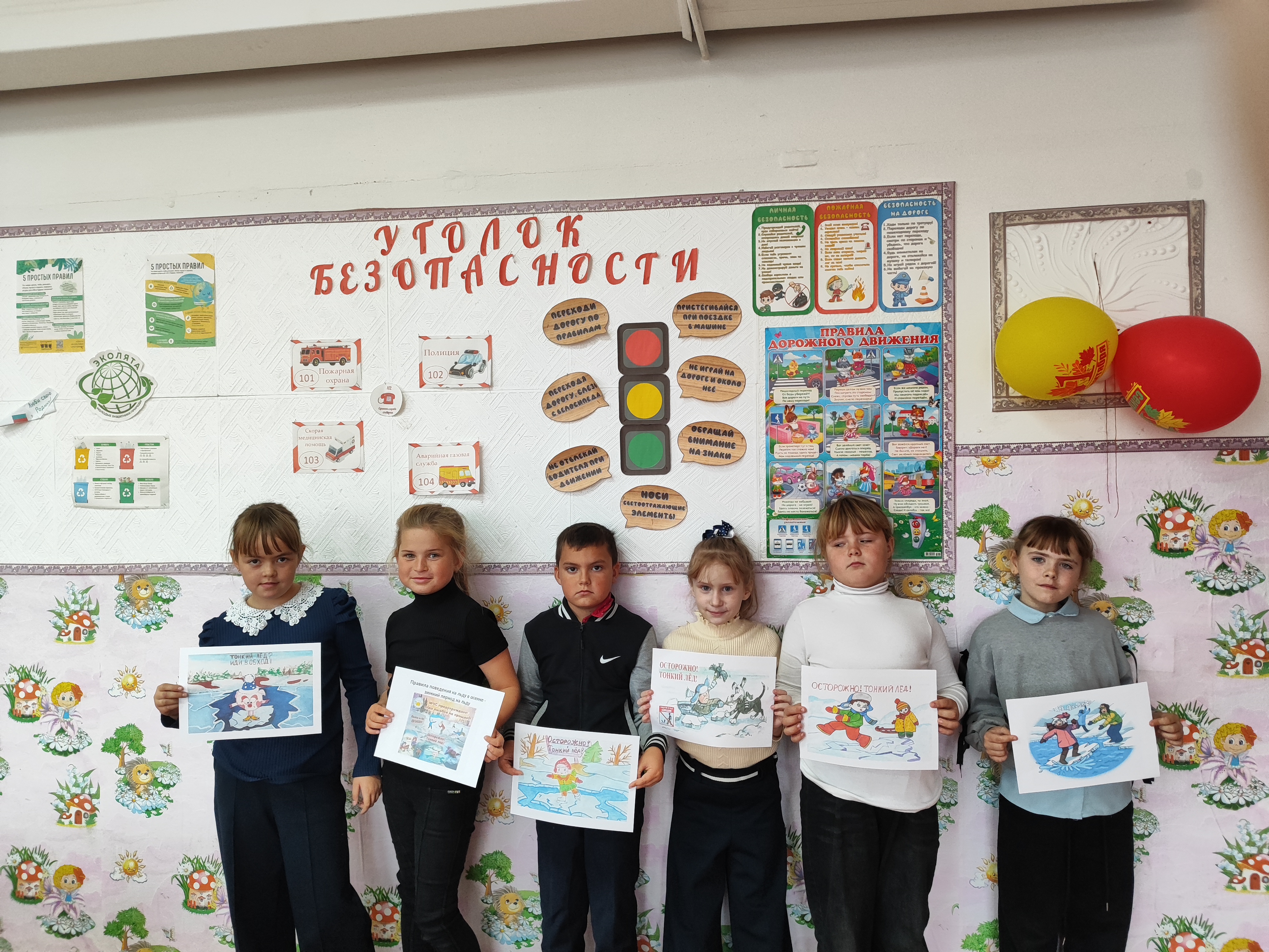 Библиотекарь рассказала ребятам о правилах безопасности на водоёмах в осенне-зимний период, об опасности непрочного льда, о правилах движения по льду, о безопасной толщине льда для пребывания на водоёме. В конце урока ребята отвечали на вопросы викторины, разукрашивали рисунки.