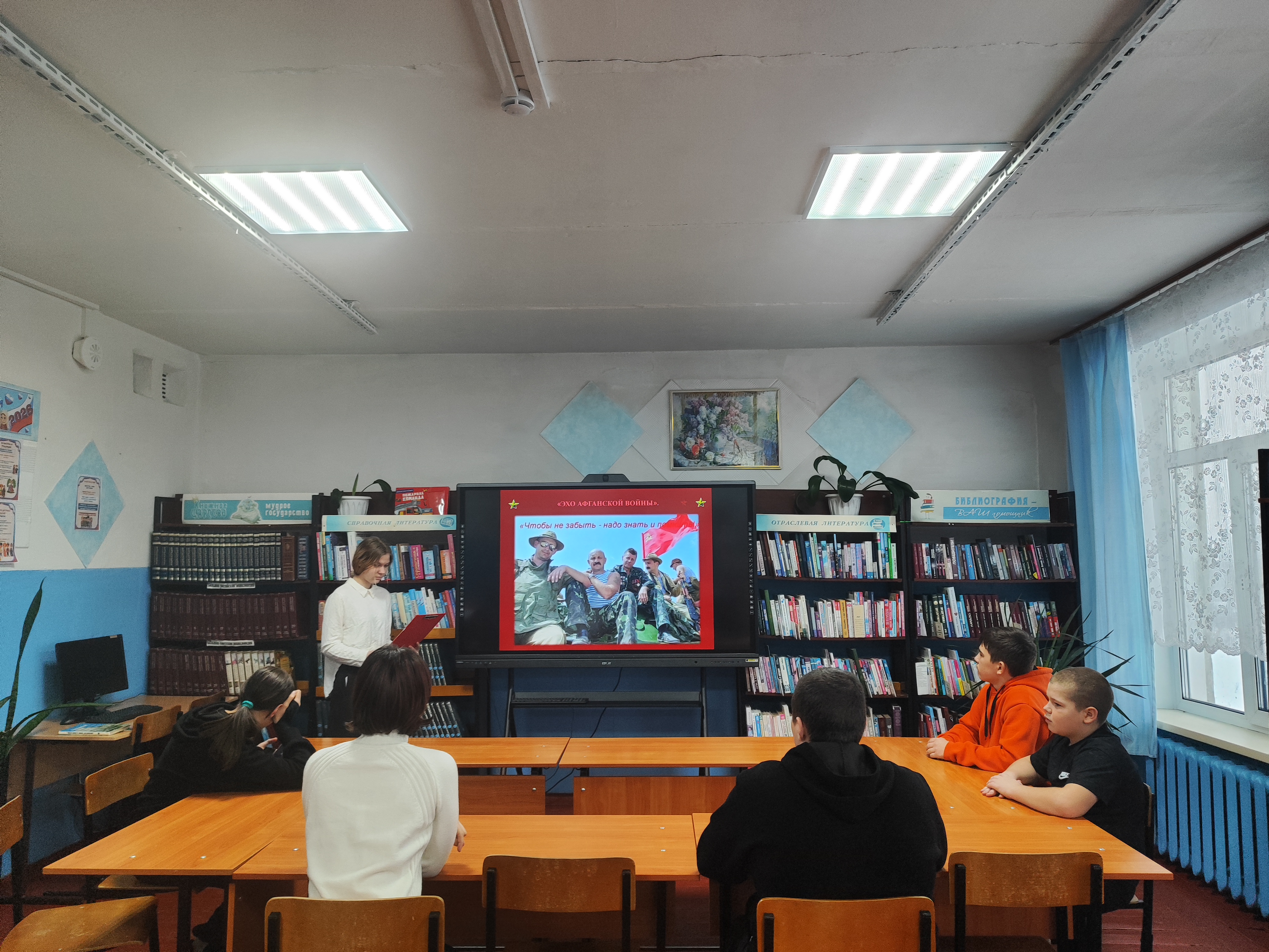Из рассказа библиотекаря подростки узнали о причинах ввода советских войск в Афганистан и исполнении воинами-афганцами интернационального долга. Рассказ сопровождался презентацией. Ребята узнали о тех нелёгких днях и тяжелых боях в республике Афганистан. Особое внимание было уделено землякам, воевавшим в Афганистане. Ребята узнали об участниках афганской войны, выходцев из нашего района, и об односельчанах, ветеранах боевых действий, отслуживших в горячих точках Республики Чечня и Дагестан. В этот день, отдавая дань памяти воинам-интернационалистам, на мероприятии прозвучали стихи и песни об афганской войне.