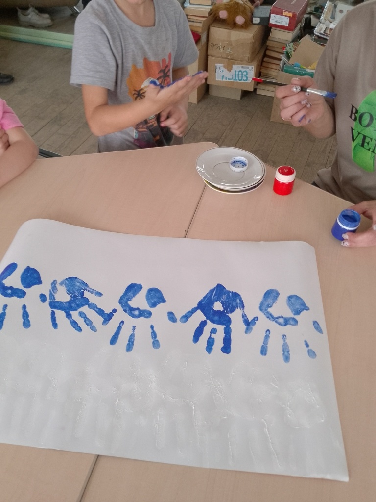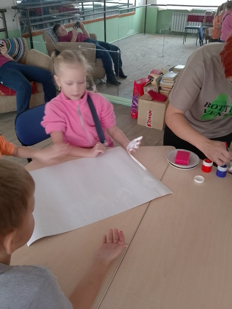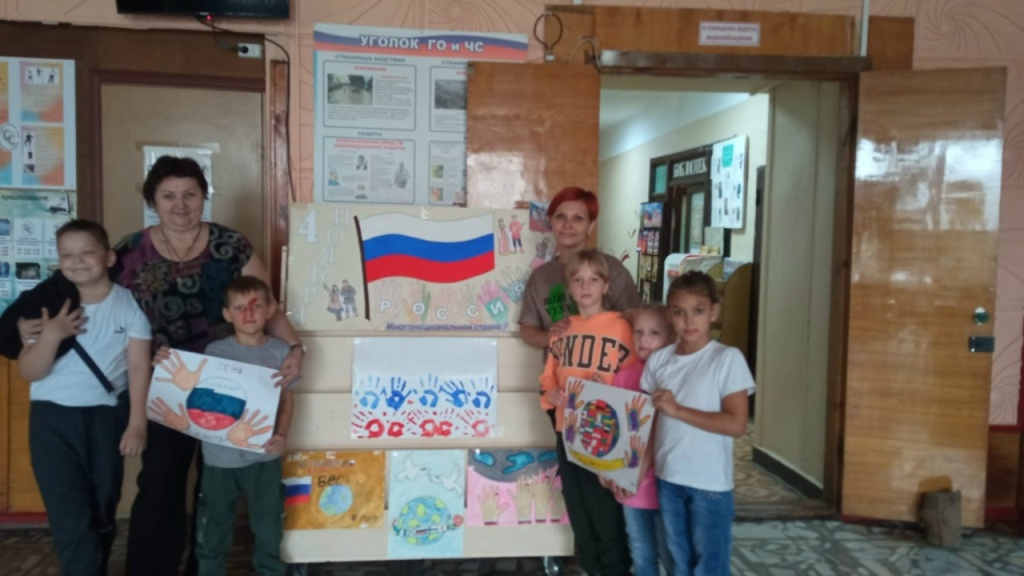 В заключение мероприятия ребята выполнили рисунки, посвященные празднику, и создали общую аппликацию «Вместе мы едины», а также Российский флаг из детских ладошек. Эти творческие работы были оформлены в виде выставки в фойе первого этажа библиотеки, что позволило всем посетителям увидеть и оценить творчество детей.