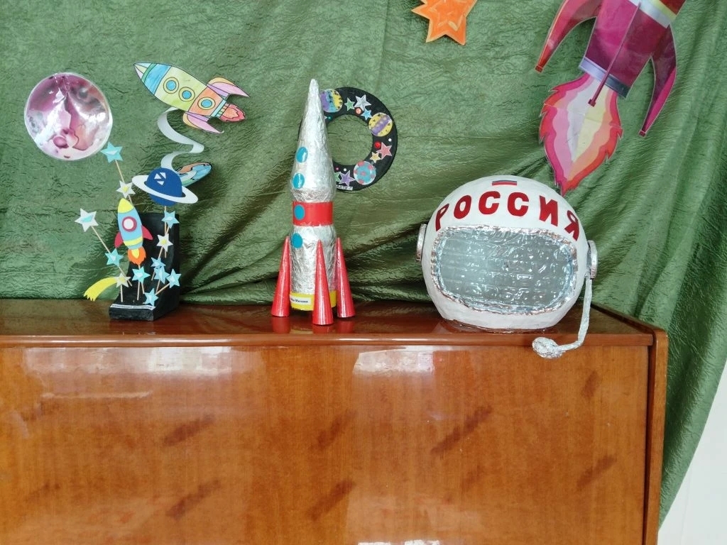 На выставке вы увидите: - Детские рисунки и поделки на космическую тематику. - Экспонаты, созданные воспитанниками детского сада и читателями библиотеки.