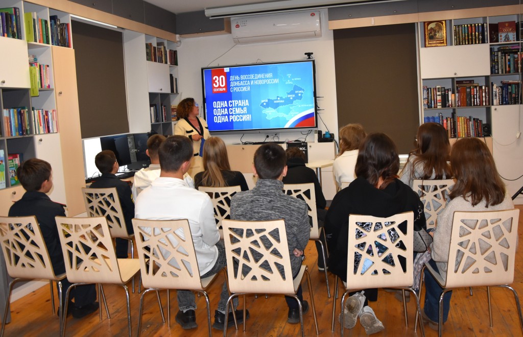 29 сентября, накануне Дня воссоединения Донецкой и Луганской Народных Республик, Запорожской и Херсонской областей с Россией в библиотеке прошёл урок патриотизма для молодёжи.