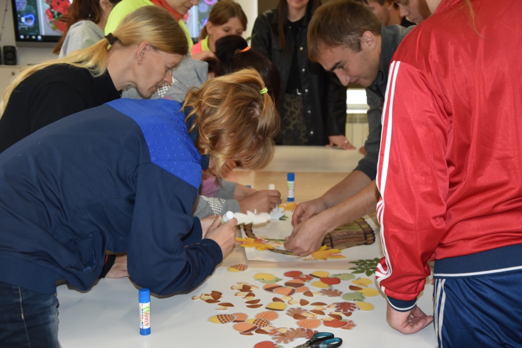 Чтобы сделать осеннюю композицию, участники мероприятия должны были раскрасить корзину, отобрать овощи и фрукты, подходящие этому времени года, а также украсить её осенними листьями.