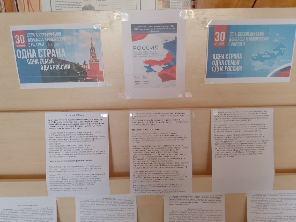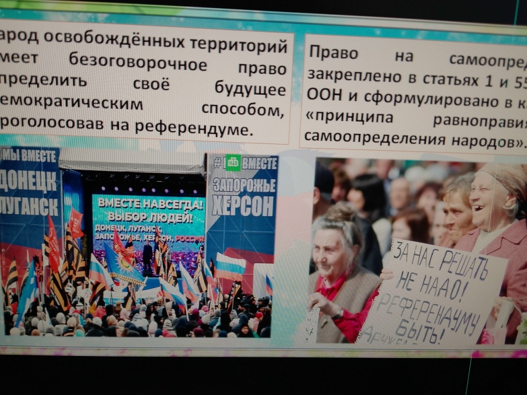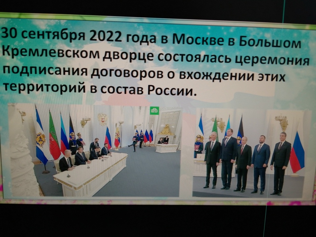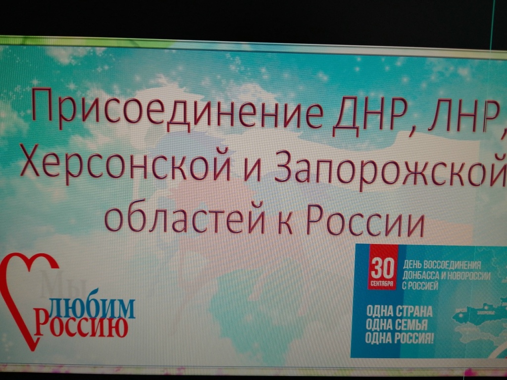 27 сентября в Сокурской библиотеке № 25 прошел информационный час, посвященный Дню воссоединения Донецкой, Луганской, Запорожской и Херсонской областей с Российской Федерацией. Собравшимся показали мультимедийную презентацию, из которой стало ясно, что договоры о включении новых территорий были подписаны после референдумов. На референдумах жители Донбасса и Новороссии практически единогласно поддержали присоединение к России.