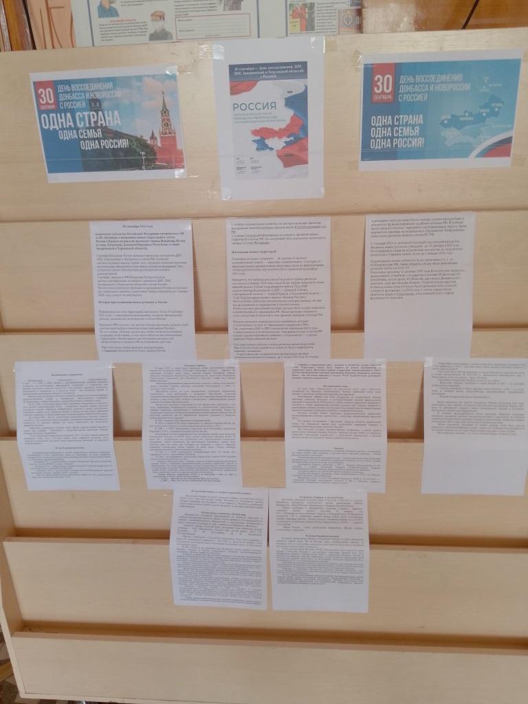 В конце сентября в нашей библиотеке открылся тематический информационный уголок «С чего начинается Родина?», приуроченный к значимой для страны исторической дате - воссоединению с регионами Донбасса и Новороссии.