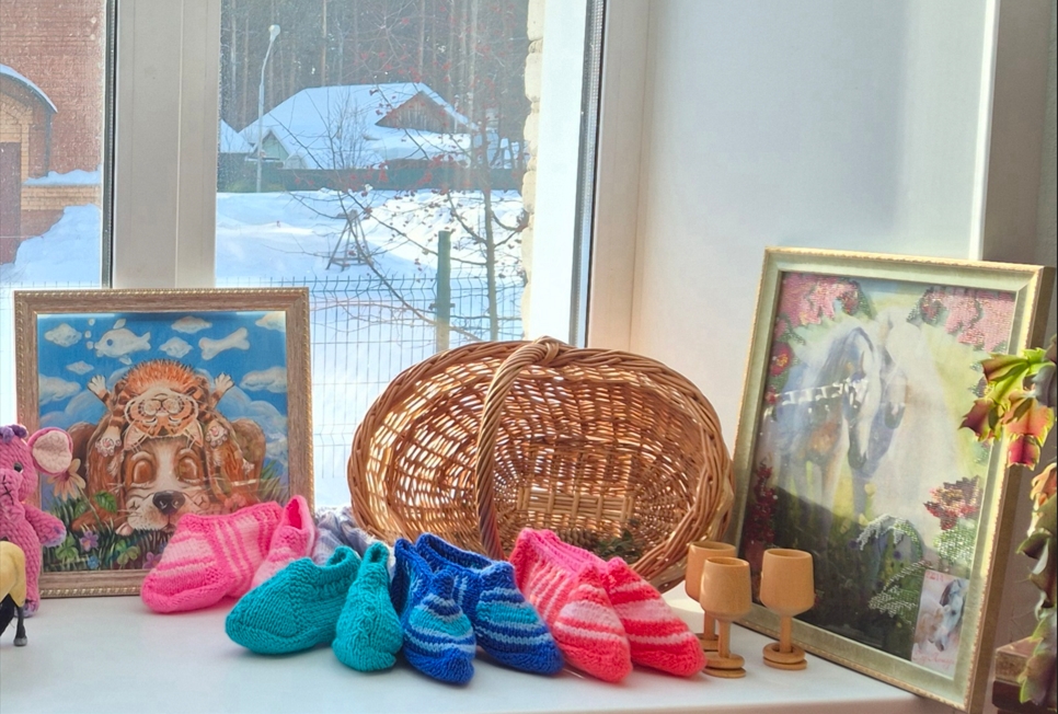 Особый уют добавили вязаные работы - крошечные пинетки, мягкие следки и забавные игрушки. Казалось, они хранят не только форму, но и само тепло ладоней мастериц. А бисерные картины сияли огоньками, словно драгоценная россыпь.