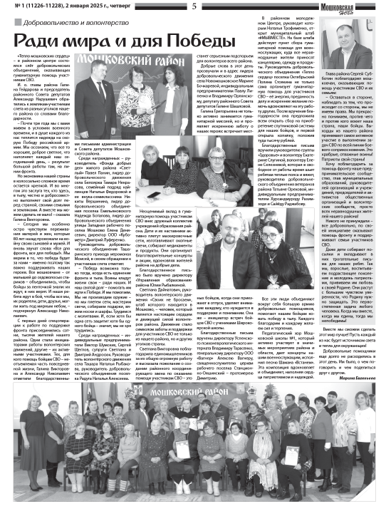 1 - Евгеньева, Марина. Ради мира и для Победы : [о слете волонтерских объединений Мошковского района Новосибирской области, состоявшемся 24 декабря 2024 в здании Администрации Мошковского района] / Евгеньева Марина. - Текст : непосредственный // Мошковская новь. - 2025 . - 2 января (№ 1). - С. 5: ил.