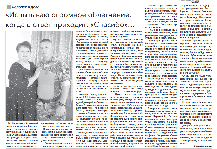 10 - Серикова, Д. "Испытываю огромное облегчение, когда в ответ приходит: "Спасибо".... :[ о волонтерской деятельности детей и педагогов школы с. Широкий Яр и о военно-патриотических встречах с участниками СВО] / Д. Серикова .- Текст: непосредственный // Мошковская новь . - 2024 . – 17 окт. (№ 42) . – С. 7: ил.