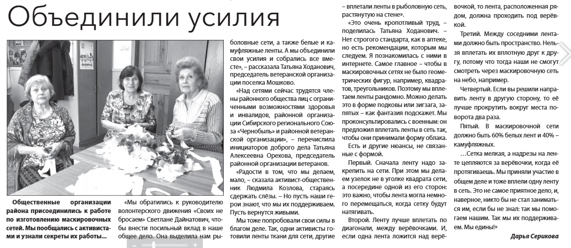 11 - Серикова, Д. Объединили усилия : [о гуманитарной помощи ветеранской организации поселка Мошково для военнослужащих из Мошковского района, участвующих в СВО ] / Д. Серикова . – Текст: непосредственный // Мошковская новь . – 2023 . – 26 янв. ( № 4) . - С. 3: ил.