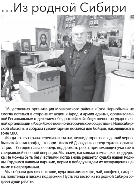 12 - ...Из родной Сибири: [об участии общественной организации Мошковского района "Союз Чернобыль" в акции "Народ и армия едины". Сбор гуманитарной помощи для бойцов СВО] // Мошковская новь . – 2023 . – 26 янв. ( № 4 ) . - С. 3: ил.