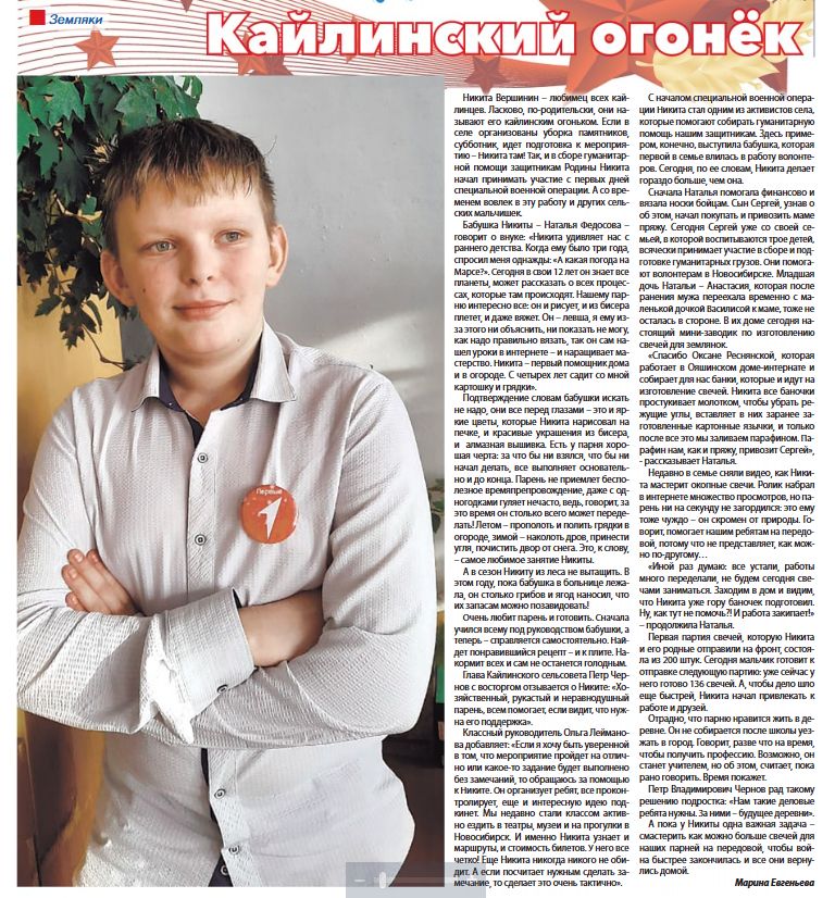 14 - Евгеньева, М. Кайлинский огонёк : [о волонтере Никите Вершинине из с. Кайлы. Он делает свечи для СВО, принимает участие в сборе гуманитарной помощи] // Мошковская новь . – 2024 . – 22 февр. ( № 8 ) . - С. 1: ил.