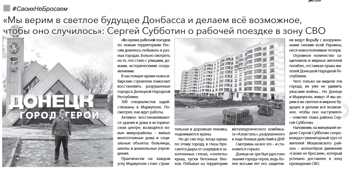 16 - "Мы верим в светлое будущее Донбасса и делаем все возможное, чтобы оно случилось": Сергей Субботин о рабочей поездке в зону СВО: [о поездке главы района с грузом гуманитарной помощи от волонтеров Мошковского района "Своих не бросаем"]. – Текст: непосредственный // Мошковская новь . – 2023 . – 4 мая ( № 18) . - С. 3: фот.