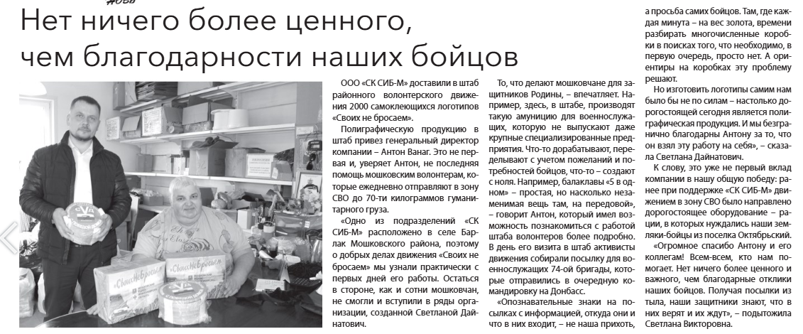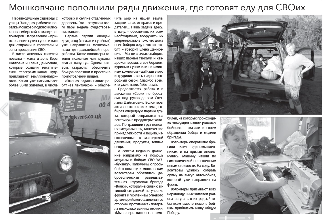 «Своих не бросаем !»// МБУ Мошковского района [ В Мошковском районе с момента начала мобилизации работает волонтерское движение по оказанию помощи военнослужащим, которые находятся в зоне проведения СВО.] .- URL: https://moshkcson.nso.ru/news/2877