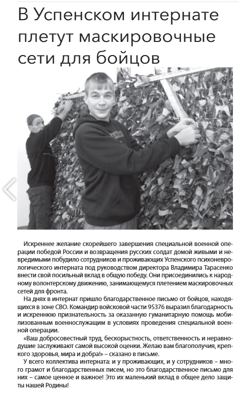 18 - В Успенском интернате плетут маскировочные сети для бойцов: [воспитанники Успенского интерната плетут маскировочные сети для нужд Российской армии].- Текст: непосредственный // Мошковская новь .- 2023 .- 19 окт. ( № 42 ) .- С. 4: фот.