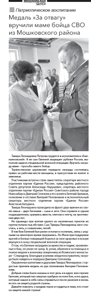 2 - Медаль за отвагу вручили маме бойца СВО из Мошковского района: [ о вручении Петровой Тамаре Леонидовне награды сына Петрова Евгения, участника Специальной военной операции (СВО)] . - Текст: непосредственный // Мошковская новь . - 2025 . - 27 февр. (№ 9) . - С. 4: фот.
