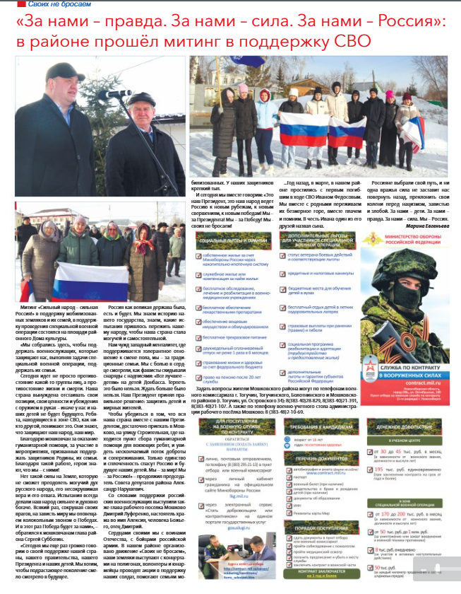 20 - Евгеньева, М. "За нами-правда. За нами-сила. За нами-Россия": в районе прошёл митинг в поддержку СВО : [о митинге под названием "Сильный народ-сильная Россия!" в поддержку специальной военной операции проходившем на площади районного Дома культуры р. п. Мошково] / М. Евгеньева . – Текст : непосредственный // Мошковская новь . - 2023 . – 30 марта ( № 13 ) . - С. 8 : ил.