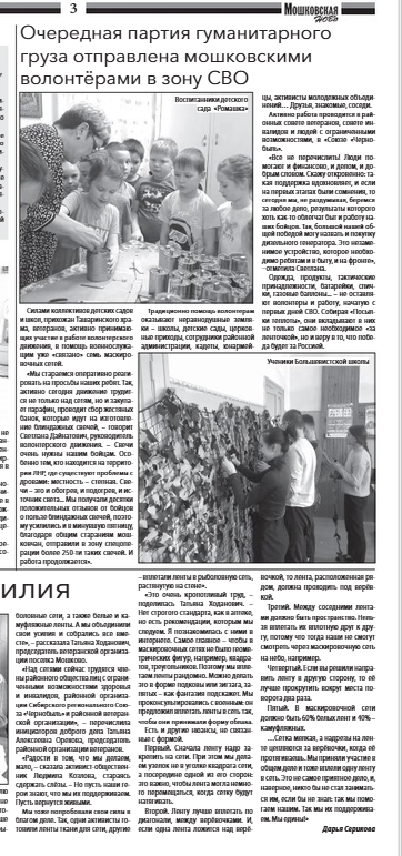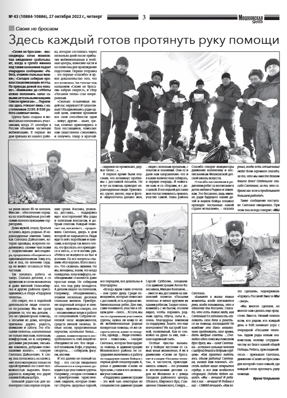 22 - Чупрынина, И. Здесь каждый готов протянуть руку помощи: [о движении волонтеров "Своих не бросаем"," Посылка теплоты" на территории Мошковского района, о сборе гуманитарной помощи для мобилизованных земляков] . - Мошковская новь . – 2022 . – 27 окт. ( № 43 ) . - С. 3: ил.