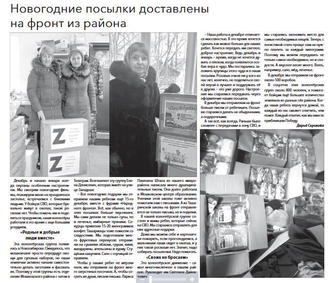 4 - Серикова, Д. Новогодние посылки доставлены на фронт из района: [о волонтерской помощи для бойцов СВО и работе движения Мошковского района "Своих не бросаем"(руководитель Дайнатович С.) / Серикова .-Текст: непосредственный // Мошковская новь .- 2024 .- 11 янв. (№ 2) .- С. 5: фот.