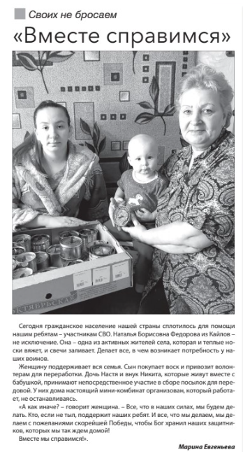 5 - Евгеньева, М. "В месте справимся": [о волонтерской помощи бойцам СВО Федоровой Натальи Борисовны из с. Кайлы] / М. Евгеньева . - Текст: непосредственный // Мошковская новь . - 2024 .- 15 февр. (№ 7 ) . - С. 3: ил.