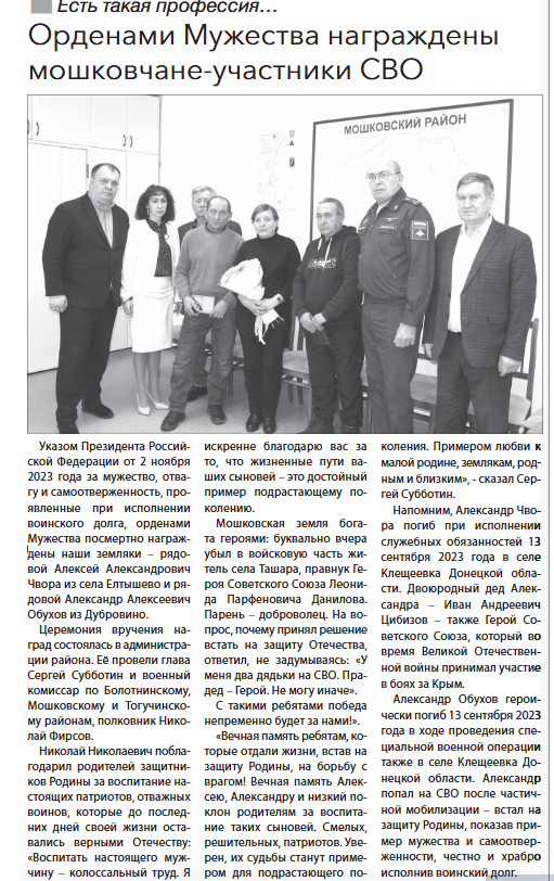 6.1 - Орденами Мужества награждены мошковчане- участники СВО:[награждены посмертно А.А. Чвора с. Елтышево. А.А. Обухова из Дубровино] . - Текст: непосредственный // Мошковская новь . - 2024 . - 7 марта (№ 10) . - С. 5: ил.