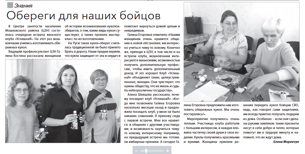 6 - Меренчук, Е. Обереги для наших бойцов: [об изготовлении оберегов для бойцов СВО участницами клуба "УспешнаЯ"] /Е. Меренчук . - Текст: непосредственный // Мошковская новь . - 2024 . - 7 марта (№ 10) . - С. 5: ил.
