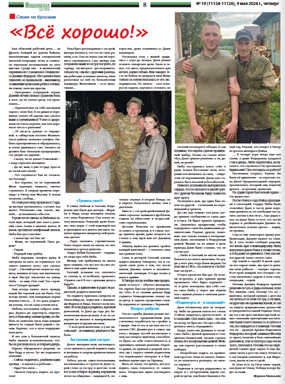 7 - Евгеньева, М. "Все хорошо!": [об участнике СВО Данииле Федорове из р. п. Станционно-Ояшинский] / М. Евгеньева . - Текст: непосредственный // Мошковская новь . - 2024 . - 9 мая ( № 19) . - С. 8: ил.