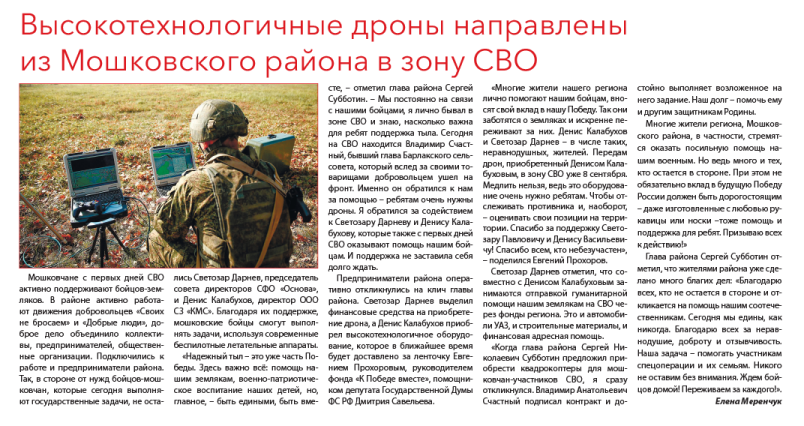 8 - Меренчук, Е. Высокотехнологичные дроны направлены из Мошковского района в зону СВО: [о гуманитарной помощи в зону СВО. Приобретение и отправка дронов предпринимателями Мошковского района] / Е. Меренчук . - Текст: непосредственный // Мошковская новь . - 2024 . - 29 авг. (№ 35) . - С. 8: ил.