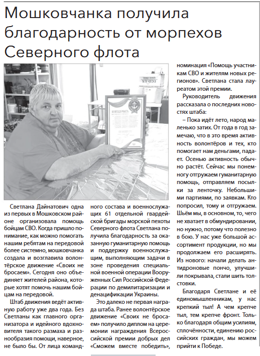 9 - Мошковчанка получила благодарность от морпехов Северного флота. [о Дайнатович С. из р. п. Мошково возглавившая движение "Своих не бросаем", объединившая волонтеров, помогающих бойцам СВО] .- Текст: непосредственный // Мошковская новь . – 2024 . – 25 июля (№ 30 ) . - С. 3: портр.