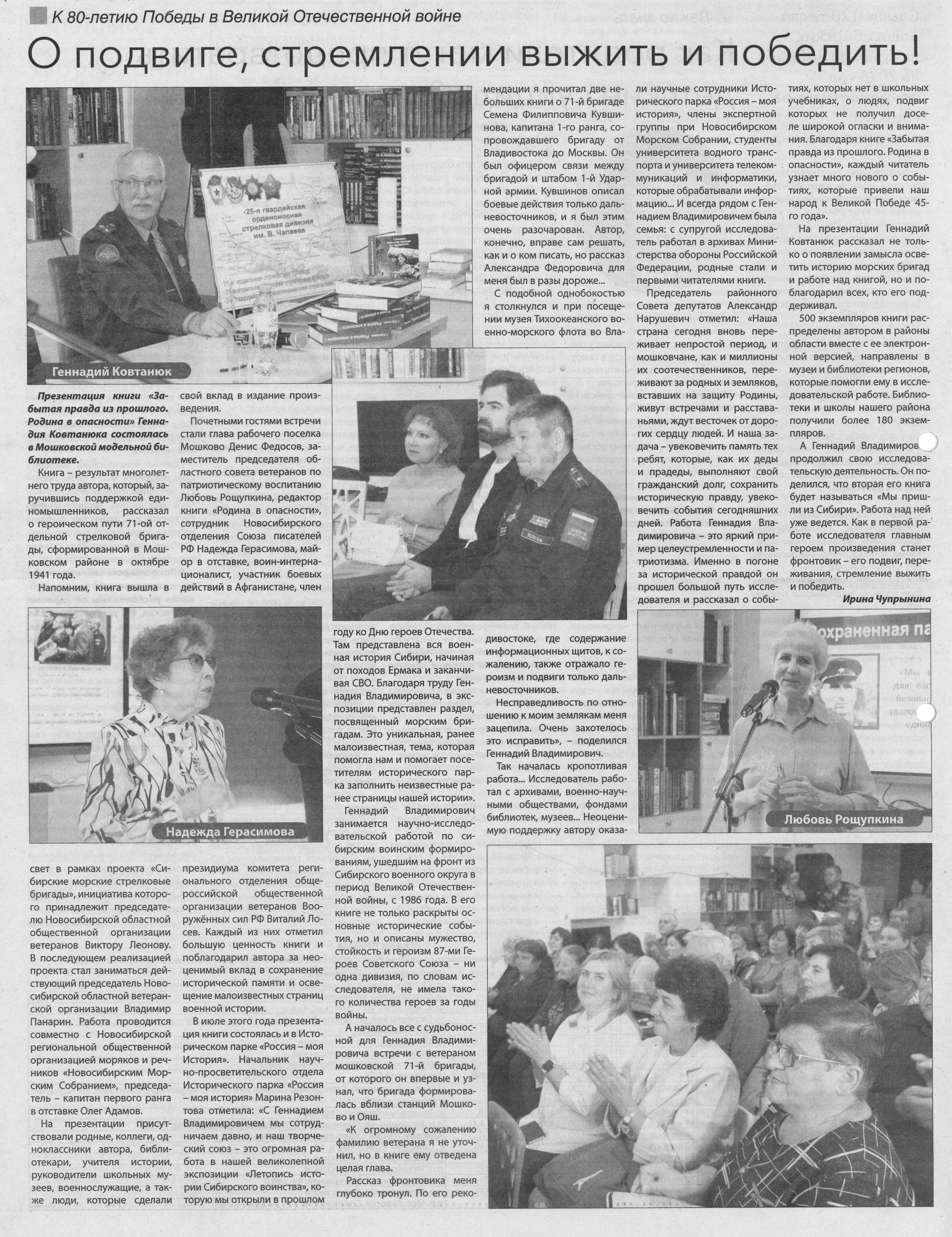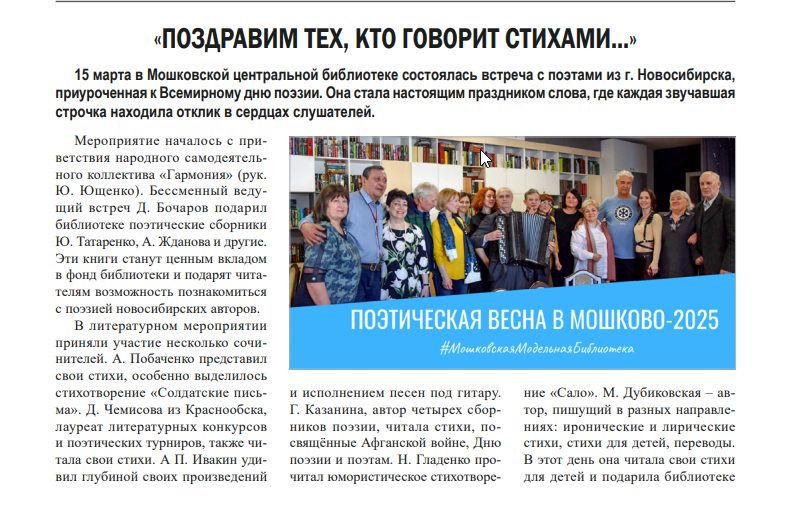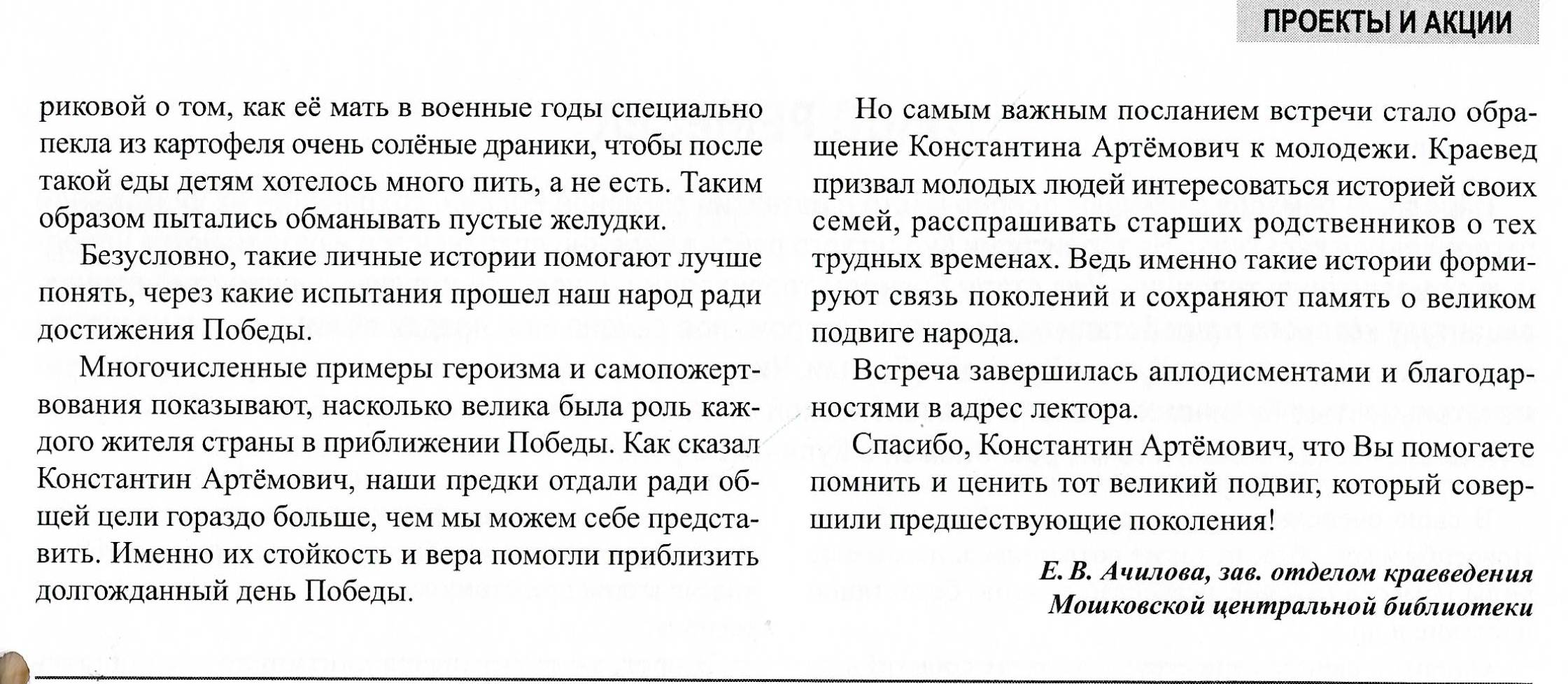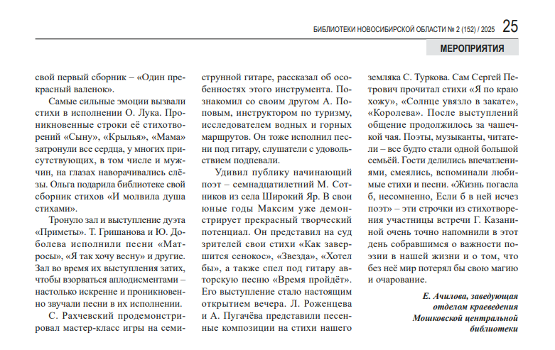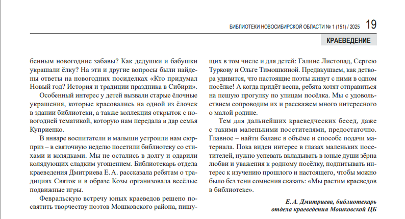 Ачилова, Е.В. Встреча с писателем - краеведом Константином Голодяевым : [10.02.2025 в рамках регионального проекта "Поколение Победы" состоялась встреча с Константином Голодяевым] / Е.В. Ачилова, зав. отделом краеведения Мошковская центральная библиотека // БИНО: БИблиотеки Новосибирской Области.- 2025. - № 1 (151).- С. 20-21 : ил.