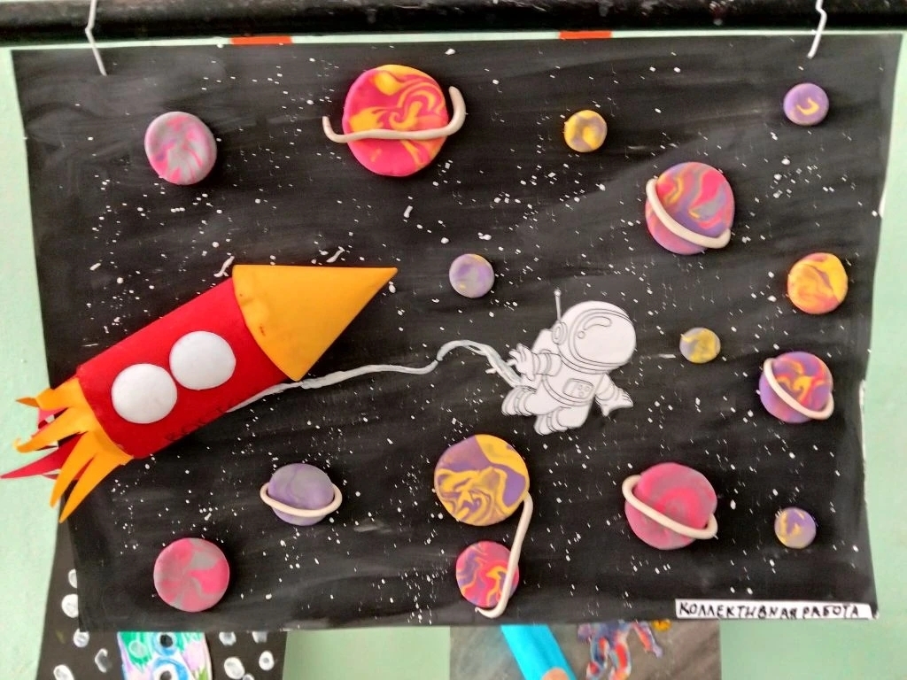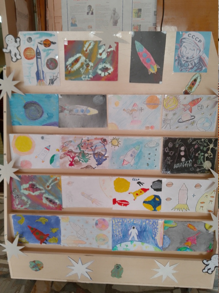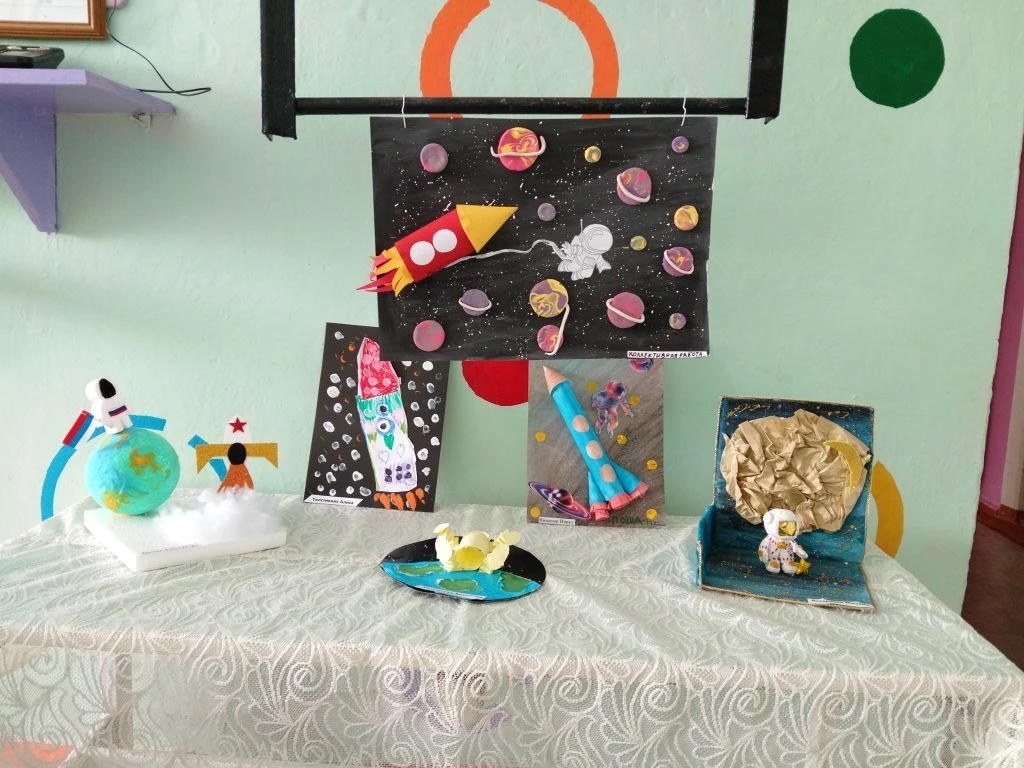 На выставке вы увидите: - Детские рисунки и поделки на космическую тематику. - Экспонаты, созданные воспитанниками детского сада и читателями библиотеки.
